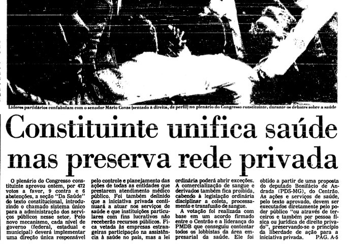 Na época, a Folha de S. Paulo publicou em 18 de maio de 1988 matéria de capa: Constituinte unifica saúde e introduz o chamado sistema único para a administração dos serviços públicos, exigindo que cada esfera de governo mantenha uma direção sanitária que seja a única responsável pelo controle e planejamento das ações e serviços de todas as suas entidades de saúde.