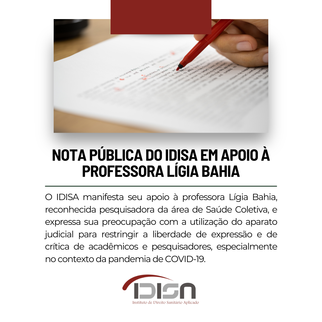 O Instituto de Direito Sanitário Aplicado (IDISA) manifesta seu apoio irrestrito à professora Lígia Bahia, reconhecida pesquisadora da área de Saúde Coletiva, e expressa sua preocupação com a utilização do aparato judicial para restringir a liberdade de expressão e de crítica de acadêmicos e pesquisadores, especialmente no contexto da pandemia de COVID-19.