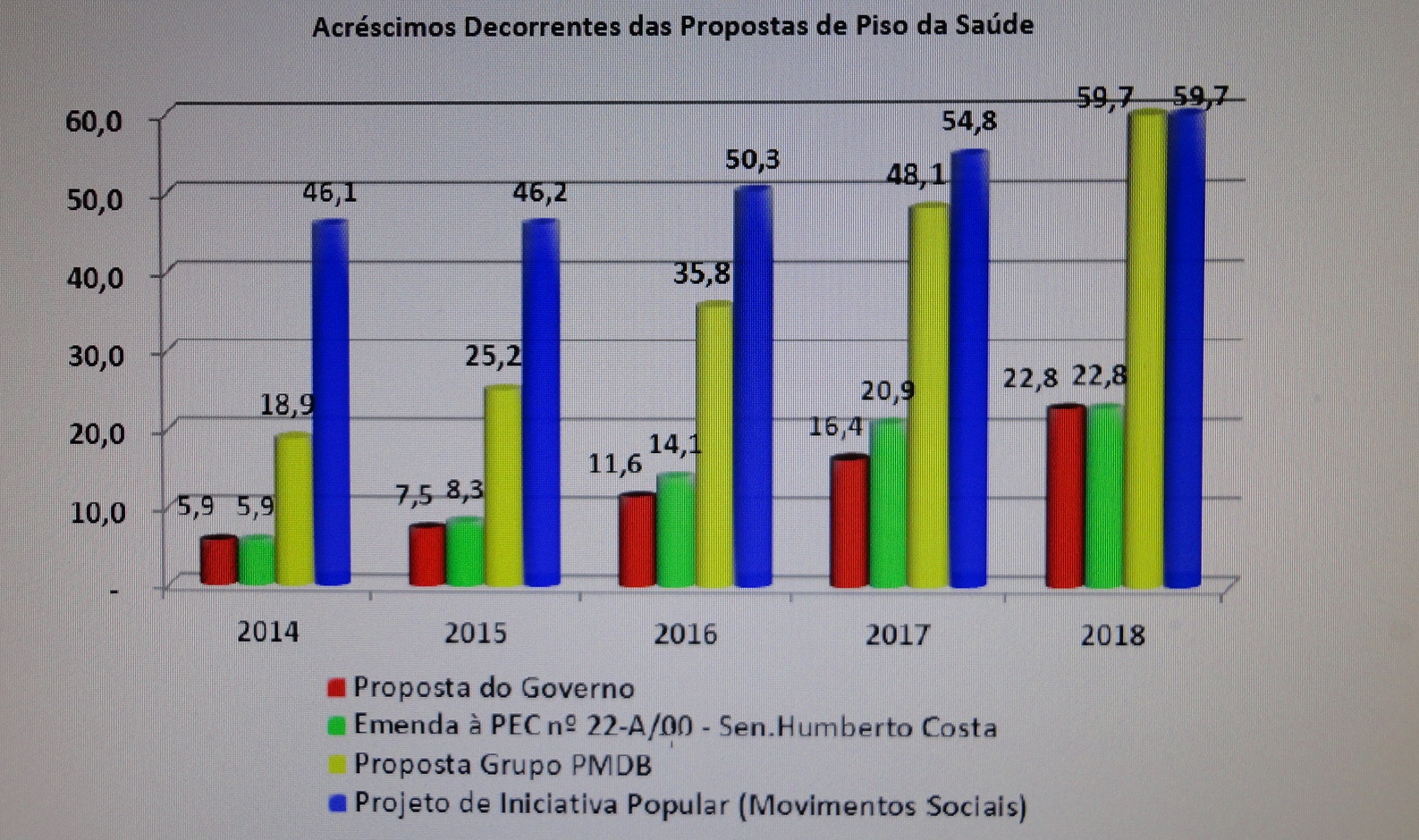 O deputado Perondi, que é o autor do PLP 123/2012, ao qual o projeto de iniciativa popular foi apensado na Câmara, informou que um grupo de deputados da área da saúde do PMDB está construindo uma proposta alternativa, estabelecendo um percentual de 18,7% das receitas correntes líquidas (RCL), que equivalem aos 10% das receitas correntes brutas, mas de forma escalonada, começando com 15% das RCL em 2014. O objetivo é chegar aos 18,7% em 2018. Pela proposta, a saúde teria, em 2014, R$18,9 bilhões anuais e, em 2018, poderia alcançar os R$ 59,7 bilhões. Nos cinco anos, seriam 187,7 bilhões a mais no setor de saúde. Esta proposta, inclusive, já foi levada pelo grupo de deputados ao vice-presidente da República, Michel Temer.