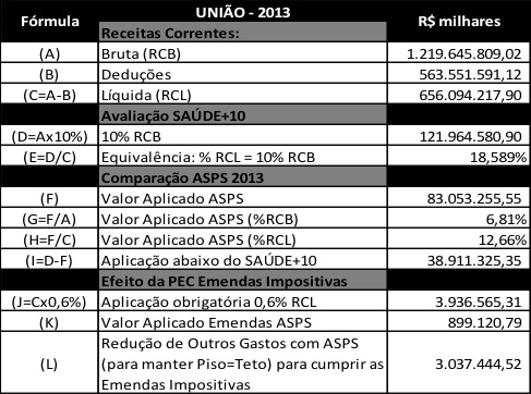 Considerando a aplicação obrigatória das emendas, é possível constatar o que esse gasto representaria uma redução de recursos já aplicados pelo Ministério da Saúde em ASPS. O cálculo a seguir considera os valores de 2013: