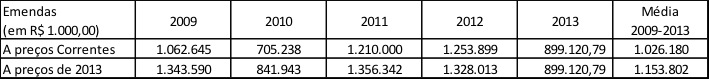 2)É oportuno observar que a execução orçamentária (valores empenhados) das emendas vinculadas ao orçamento do Ministério da Saúde totalizaram pouco mais de R$ 1,0 bilhão em média no período 2009-2013, ou seja, apenas 25% do valor que será obrigatório executar, considerando os valores apurados para 0,6% da RCL em 2013.