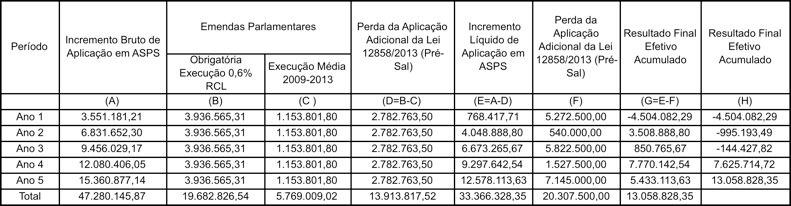 3)Considerando que essa aplicação obrigatória das emendas fará parte do gasto mínimo de aplicação legal em ASPS (pois o gasto com emendas não será um valor adicional à aplicação mínima legal), haverá uma perda de financiamento de cerca de R$ 2,8 bilhões considerando os valores de 2013, calculada pela diferença entre o total da aplicação obrigatória das emendas correspondente a 0,6% da RCL e o valor médio dessa aplicação verificado nos últimos 5 anos. Como vigora a lógica imposta pela área econômica de que aplicação mínima legal em ASPS é a aplicação máxima governamental, o acréscimo decorrente de gasto das emendas impositivas resultará na redução de outras despesas já realizadas pelo Ministério da Saúde. Assim sendo, o cálculo anterior do incremento bruto gerado pelo porcentual progressivo da aplicação proposta pela PEC deverá ser deduzido desse gasto obrigatório das emendas, o que faria com que, no primeiro ano, houvesse uma aplicação adicional de apenas R$ 768 milhões (calculada com base nos valores de 2013).