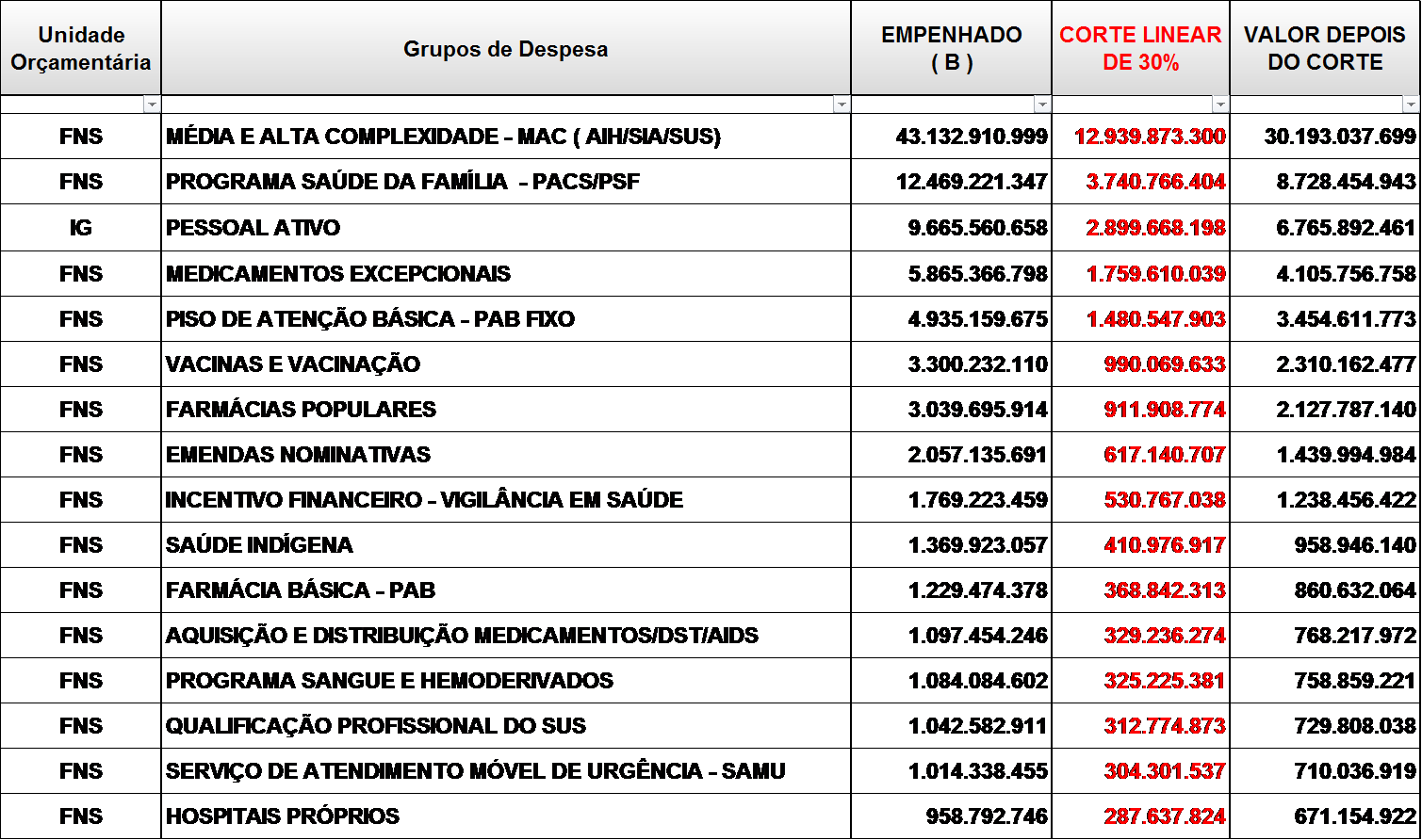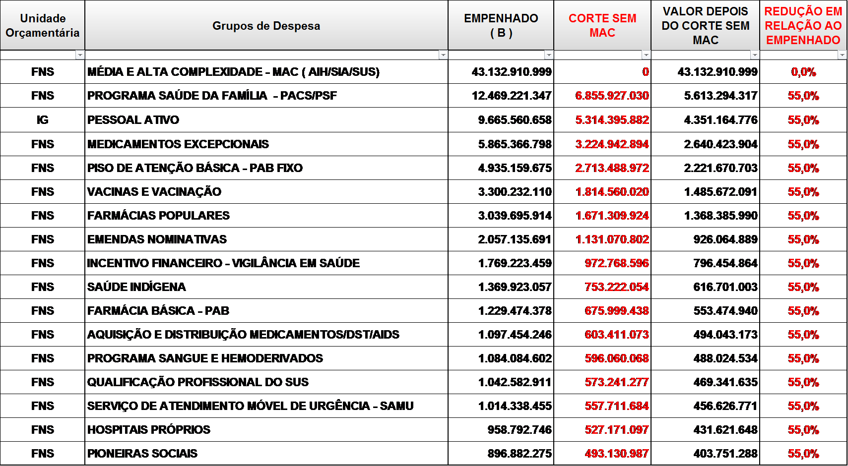 Na hipótese de não serem cortadas as despesas com as transferências para Estados, Distrito Federal e Municípios do bloco de Média e Alta Complexidade, as demais despesas selecionadas na Tabela 4 seriam reduzidas em 55% comparativamente ao valor efetivamente empenhado em 2015.