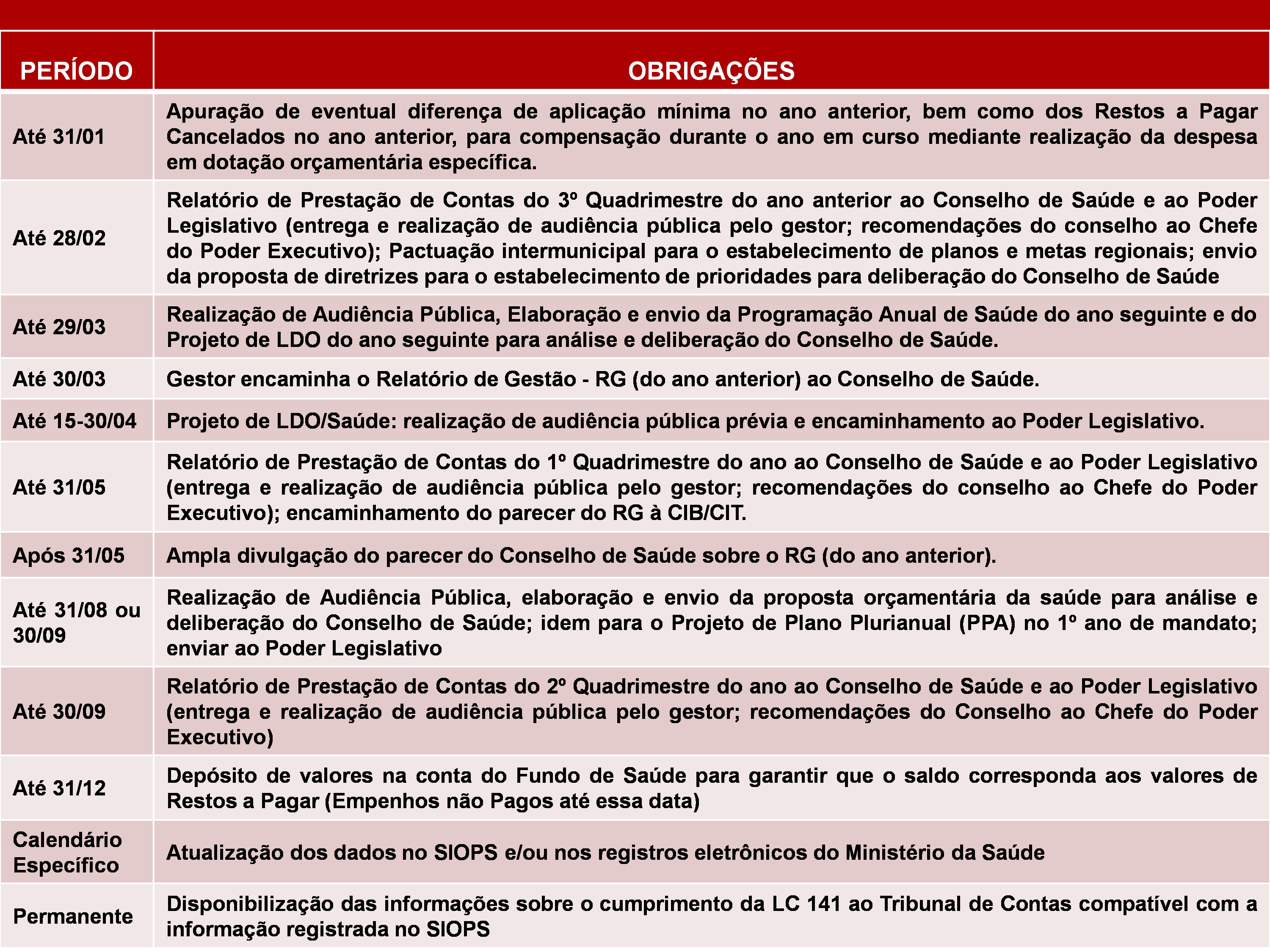 ANEXO: CALENDÁRIO DE OBRIGAÇÕES DO GESTOR – LC 141