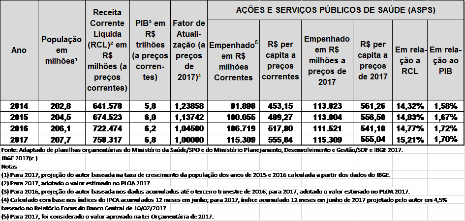 (5) Parâmetro atualizado pelo autor da Receita Corrente Líquida (RCL) de 2016: arrecadada janeiro a dezembro (disponível em http://portalsaude.saude.gov.br/index.php/o-ministerio/principal/siops/mais-sobre-siops/16311); parâmetro mantido da Receita Corrente Líquida (RCL) de 2017 de R$ 758,3 bilhões, conforme PLOA 2017; RCL de 2018 a 2036: taxa de crescimento real igual à do PIB, o que mantém a RCL em 11,48% (atualizado pelo autor) do PIB no período.