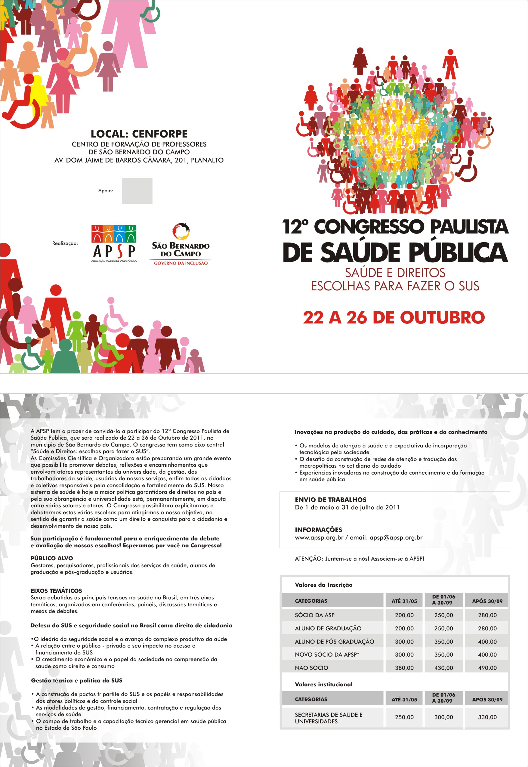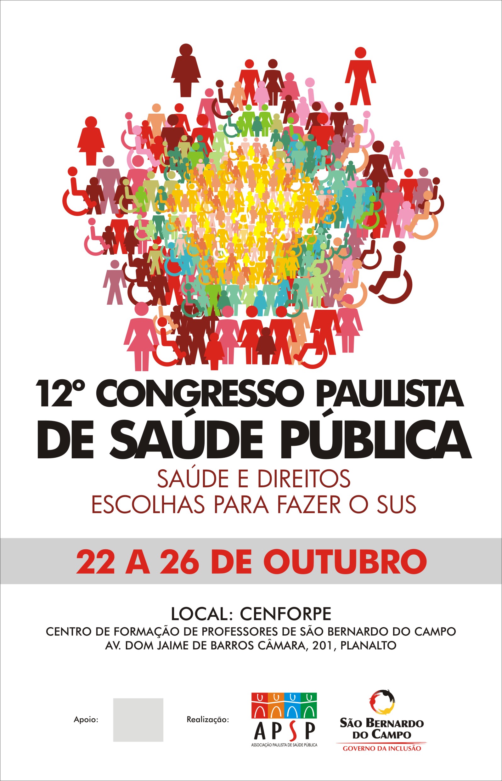 Encaminho em anexo material de divulgação do Congresso Paulista de Saúde Pública, promovido pela APSP – Associação Paulista de Saúde Pública – que acontecerá no período de 22 a 26 de Outubro em São Bernardo do Campo. A APSP, em quase 40 anos de história, tem se caracterizado como um importante espaço para debates e reflexões acerca das políticas públicas de saúde. É um espaço plural de muitos partidos e opiniões, de feitos e contribuições decisivos, de ofertas generosas ao debate sintetizadas nos temas de suas atividades, especialmente nas onze edições do Congresso Paulista de Saúde Pública, e nas publicações da Revista Saúde e Sociedade, lançada em 1992.